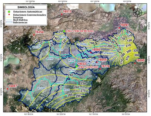 El análisis meteorológico consistió en identificar las estaciones cercanas a la cuenca, resultando seis EMC y dos EMA; para conocer la influencia de éstas por subcuenca se generaron isoyetas para septiembre de 2013 (Figura 2).