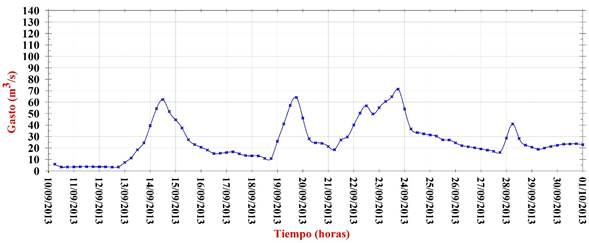 Con el registro de las precipitaciones para el mes de septiembre de 2013 de las EMA se generó un hietograma adimensional y que fue base para generar hietogramas en las EMC. Por otra parte, con el registro histórico de las EMC se analizaron las máximas en 24 horas, con lo cual se estimaron precipitaciones para los periodos de retorno (Tr) de 100 y 500 años, con la función de distribución de probabilidad Gumbel.