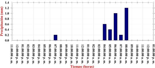 No se tuvo acceso a los datos pluviométricos para generar hietogramas con intervalos menores a 24 horas. Sin embargo, se retomó la metodología de López et al. (2012), partiendo del registro de precipitación en algunas EMA vecinas fuera o dentro de la cuenca (que por lo general reportan precipitación cada 10 minutos), se asume que la distribución en 24 horas de los valores diarios en las EMC es similar al de las EMA.