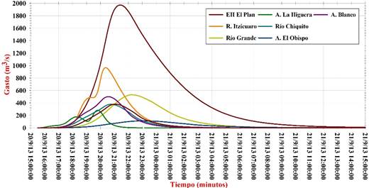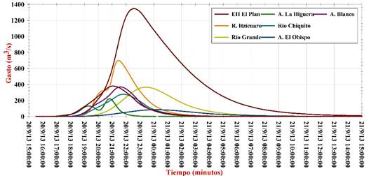 Se corrió el modelo hidrológico para los eventos con duración de 24 horas y obtuvieron los hidrogramas para cada subcuenca que, a su vez, corresponden a los cauces tributarios que aportan escurrimientos al río Grande en su tramo por la ciudad (Figura 6 y Figura 7).