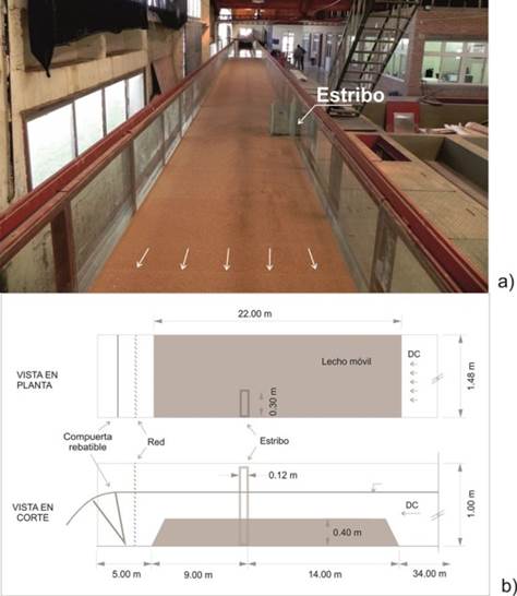 Los experimentos se llevaron a cabo en un canal de sección rectangular de 60 m de largo, 1.48 m de ancho y 1.00 m de profundidad (Figura 1a), perteneciente al Laboratorio de Hidráulica de la Facultad de Ingeniería y Ciencias Hídricas (FICH) de la Universidad Nacional del Litoral (UNL), Santa Fe, Argentina. El canal posee un lecho erosionable, horizontal, de 22 m de longitud y 0.40 m de espesor, constituido por arena uniforme, con un diámetro medio de 0.001 m. A los 14 m de iniciado el tramo con fondo móvil se representa un estribo prismático con paredes verticales de vidrio de 0.3 m de longitud y 0.12 m de ancho (Figura 1b).