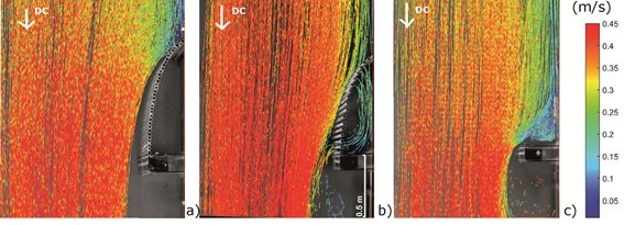 La Figura 10b demuestra cómo, a medida que el muro adquiere transparencia, una porción del flujo ingresa al sector delimitado por la presencia del muro, el cual es interceptado por el estribo, imponiéndole una dirección casi paralela a su eje. Este flujo se ve interferido de manera directa por la presencia de los pilotes, pudiendo afectar así las erosiones resultantes junto al estribo. Tal comportamiento resulta menos marcado a medida que el muro ensayado fue más transparente.