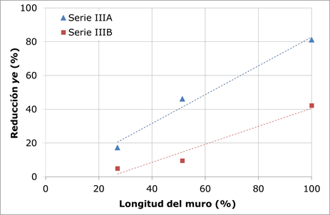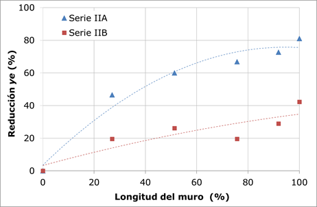 Los resultados derivados de los ensayos involucrados en la Serie IIA demostraron que la máxima profundidad de erosión se vincula fuertemente con la longitud del muro guía. Esta afirmación se basa en el hecho de que a medida que se incrementó la longitud del muro, las reducciones de la máxima profundidad de erosión fueron mayores, ajustándose con una tendencia polinómica de segundo grado, representada por la línea de trazos azul en la figura. No obstante ello, las reducciones de la máxima profundidad de erosión fueron de consideración incluso para la menor de las longitudes evaluadas (27% de la longitud total), en la que reducción de la erosión máxima ye fue de 47%.