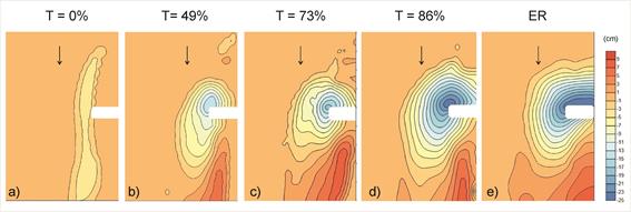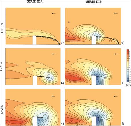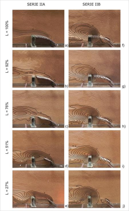 Este comportamiento se observa también cuando se analiza la morfología del lecho obtenida en cada uno de los experimentos de la Serie II, tal como se muestra en la Figura 12, en la cual se presentan fotografías de los lechos resultantes de cada experimento, sobre las cuales se han superpuesto las líneas de nivel en el sector erosionado, con una equidistancia de 0.02 m. En la figura 12, columna izquierda, se tienen los resultados correspondientes a la Serie IIA de experimentos, donde la primera imagen (Figura 12a) muestra la mayor longitud de muro considerada; y la última (Figura 12e), la correspondiente a la menor longitud ensayada (L = 27%); mientras que la columna de la derecha muestra las mismas longitudes de muro, pero con un grado de trasparencia próximo a 49%.