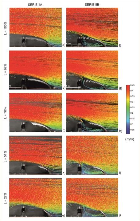 Para una longitud de 27% (Figura 13e), se puede observar que algunos trazadores ingresan al sector ubicado aguas arriba del estribo protegido por el muro guía. Las velocidades de estos trazadores son bajas respecto de las observadas en el resto de la sección transversal, evidenciando la poca circulación que posee el flujo en este sector. Los resultados descritos permiten afirmar que la presencia de muros guías con transparencia nula (T = 0%) y diferentes longitudes demuestran un comportamiento compatible con el propósito original de un muro guía, ordenando el flujo y afectando la típica configuración tridimensional que promueve la erosión local junto al estribo. Este comportamiento resulta destacable aun para el muro con menor desarrollo longitudinal considerado.