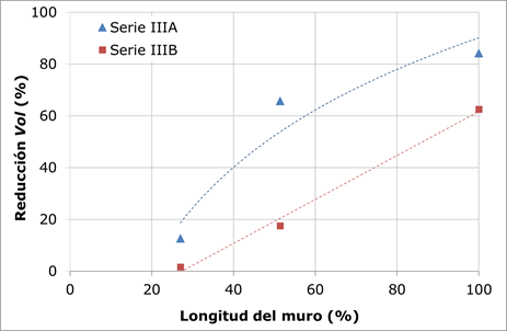 Figura 15 Reducción del volumen de sedimentos removido en función de la longitud del muro guía para la Serie IIIA (T = 0%) y Serie IIIB (T ~ 49%).
