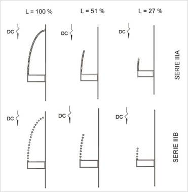 Serie II. Se representaron distintas longitudes de muro (L), consideradas como un porcentaje respecto del desarrollo total del mismo. Tales muros estuvieron adosados a la pared del canal, respetando la traza seleccionada (el mismo cuarto de elipse), pero sin llegar a la cara aguas arriba del estribo. En esta serie se consideraron dos tipos de muros: uno impermeable (transparencia nula, Serie IIA) y otros con una transparencia próxima a 49% (Serie IIB).