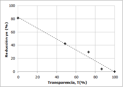 En la figura 5 se presenta la variación de la reducción de la máxima profundidad de erosión (calculada con la Ecuación (2)), como una función de la transparencia del muro guía adoptado, expresadas en %.