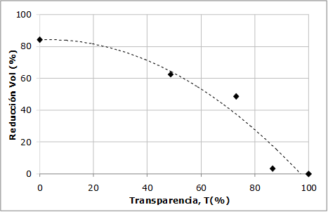 La tendencia en la reducción del volumen erosionado en presencia del muro guía presenta algunos aspectos diferentes respecto de lo observado para las máximas profundidades de erosión. En la Figura 6 se muestra la variación de la reducción del volumen erosionado (Ecuación (3)) en relación con la transparencia del muro completo; ambas variables expresadas en %. Los datos se ajustan con una tendencia polinómica de segundo grado, representada por la línea de trazos en la figura.