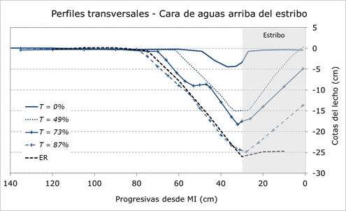 En Figura 9 puede verse como, en todos los casos analizados, el sector de máximas profundizaciones se localizó en correspondencia con el extremo exterior del estribo (Progresiva = 30 cm de la Figura 9). Se observó que las profundidades de erosión fueron mínimas cuando el muro se conformó con una transparencia nula, reafirmando el hecho de que tales dispositivos constituyen una eficaz medida de protección contra la erosión local junto a estribos de puente (Lagasse, Zevenbergen, Schall, & Clopper, 2001; Maza-Alvarez, 1989).
