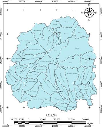 Con 25 cartas topográficas vectoriales con curvas de nivel a 10 metros de equidistancia, y con el software Envi 4.5, se generó el Modelo Digital de Elevación (MDE) de la zona de estudio, con resolución espacial de 1 m. El procedimiento para dividir la zona en subcuencas consistió en el uso de la herramienta ArcHydro de ArcGIS 10.2.