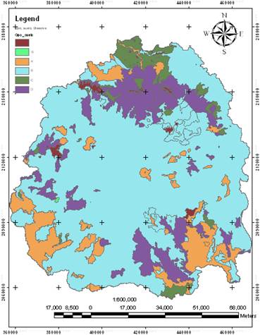 La Figura 3 muestra la distribución de los grupos hidrológicos de suelo, donde se identificaron cuatro grupos que varían de acuerdo con las características físicas del suelo. El grupo dominante es el B, con 66.9% del área, que corresponde a suelo de textura media con moderada permeabilidad en estado mojado. Le sigue el grupo D, con 14.7%, correspondiente a suelos muy impermeables que favorecen el escurrimiento y por lo tanto la erosión.