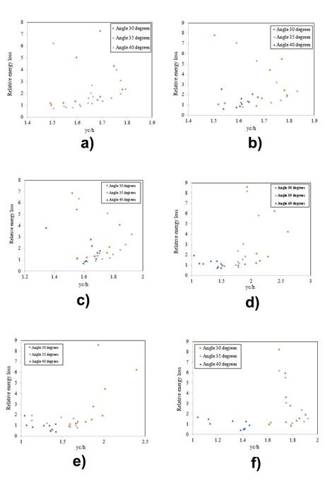 Figure 4 (d, e, f) shows the effect of weir slope angle on energy dissipation in weirs with cubic baffles. As can be observed, energy dissipation is inversely related to slope angle, so that increasing the former would lead to a decrease in the latter. Therefore, the effect of baffles on energy dissipation reduction diminished as baffle height was increased.
