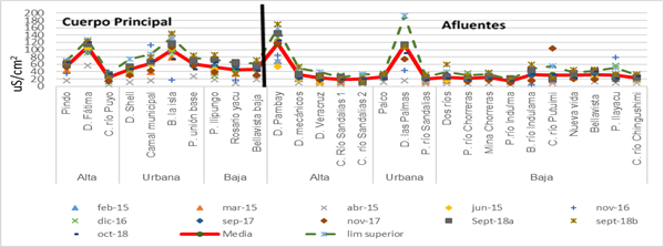 La conductividad eléctrica a nivel general en todas las fechas (Figura 3) presenta mayores reportes en el curso principal, en la zona alta, en los diques Fátima, Pambay y las Palmas, donde su media sobrepasa los 100 uS/cm2, posteriormente disminuye en las zonas bajas de la cuenca; esto puede deberse a la presencia de mayores caudales, que generan mayor dilución. En los afluentes se reporta mayor conductividad eléctrica en la zona alta en el dique Pambay, así como en la zona urbana, en el dique Las Palmas; los valores son menores en los otros puntos de monitoreo. El punto dique de Shell es el que reporta mayor coeficiente de variación (Tabla 2).