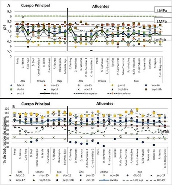 Los niveles de saturación de oxígeno (Figura 4b) estuvieron en todos los puntos sobre el límite mínimo permisible, que para ambos criterios señalados debe sobrepasar el 80 % de saturación, con excepción de las fechas de junio de 2015 en los diques Shell, Los Mecánicos, Veracruz; Las Palmas, en los puntos Camal Municipal, Cabeceras del río Sandalias 1 y 2, Dos Ríos, balneario del río Indulama, cabeceras del río Putuimi y Bellavista; también algunos puntos en noviembre de 2016 y octubre de 2018. Los puntos donde reiteradamente se reportan valores por debajo del límite mínimo son en el cuerpo principal de las cabeceras del río Puyo, el Camal Municipal, barrio La Isla, y en los afluentes de los diques Los Mecánicos y Veracruz, y en las cabeceras del río Sandalias 2. Los promedios del curso principal registran valores superiores al 80 %, disminuyendo en la zona urbana e incrementándose en la zona baja, lo cual, al ser el mismo curso hídrico, representan una reoxigenación en las zonas bajas. En los afluentes, las menores concentraciones se tuvieron en el dique Mecánicos, y en las cabeceras del río Sandalias 2.