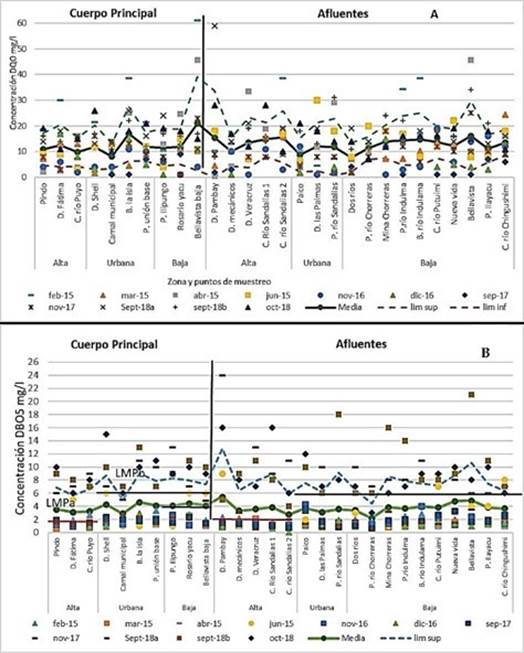 En la demanda bioquímica de oxígeno (Figura 5b) se consideró el límite máximo permisible para criterios de calidad admisible de la DB05 para la protección de la vida acuática no impactada, que corresponde a zonas de la cuenca alta, donde el límite es 2 mg/l, y con impacto moderado correspondiente a zonas urbana y baja, donde el límite máximo es 6 mg/l. Los muestreos indicaron valores superiores a los establecido en la norma en el curso principal en 2015 en la zona alta en febrero en las cabeceras del río Puyo; en el mes de abril, en el punto Pindo; mientras en el mes de junio, en la zona alta, en el punto dique de Fátima y en los afluentes en el mes de junio, en la zona alta en el dique del río Pambay; y en la zona baja, en las cabeceras del río Putuimi, Nueva Vida y cabeceras del río Chingushimi. En los muestreos de noviembre de 2017, septiembre de 2018 (a y b), y octubre de 2018, la mayoría de puntos sobrepasa el límite máximo permisible. Los valores promedio en el curso principal y afluentes se encuentran dentro de lo establecido en los límites permisibles de la normativa ecuatoriana en las zonas urbana y baja, donde se considera una condición de impacto moderado para la vida acuática; pero no así en la zona alta, donde se considera vida acuática no impactada. A su vez, se reportan mayores concentraciones en el curso principal en los sectores Rosario Yacu, dique de Shell y barrio La Isla, y en los afluentes en el dique Pambay.
