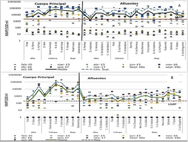 En el cuerpo principal, las concentraciones de coliformes totales y fecales se incrementa en escala exponencial a partir de la zona urbana; esto se refleja en sus promedios, sobrepasando los 10 000 NMP/100 ml en ambas medidas; al tener mayores aportes de aguas residuales dispuestas en el sistema de alcantarillado y posteriormente vertidos en el curso hídrico, sobrepasa el límite establecido en la normativa. Esta tendencia no se observa en los afluentes.