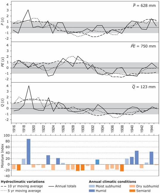 Figure 3 Hydroclimatic variations over the period 1916-1945 and annual climatic conditions based on the Moisture Index of Thornthwaite (1948). Hydroclimatic variables include rainfall (P), potential evapotranspiration (PE), and runoff (Q). Absolute values for all three variables were expressed in mm yr-1.