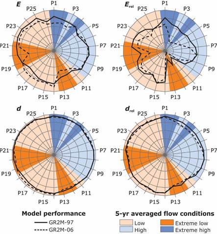 Figure 5 Performance of the GR2M-97 and GR2M-06 models by calibration period (P1 to P26). Radial charts increase from 0.5 (center) to 1 (outbound circle).