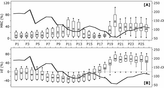Figure 6 GR2M-97 performance variations from calibration to validation based on A) a model robustness criteria (MRC), and B) the volume error [VE]. The black thick line illustrates the mean annual runoff by the validation period.