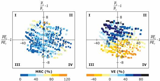 Figure 7 Distribution of MRC and VE values against relative variations in mean annual rainfall () and potential evapotranspiration () from calibration to validation.