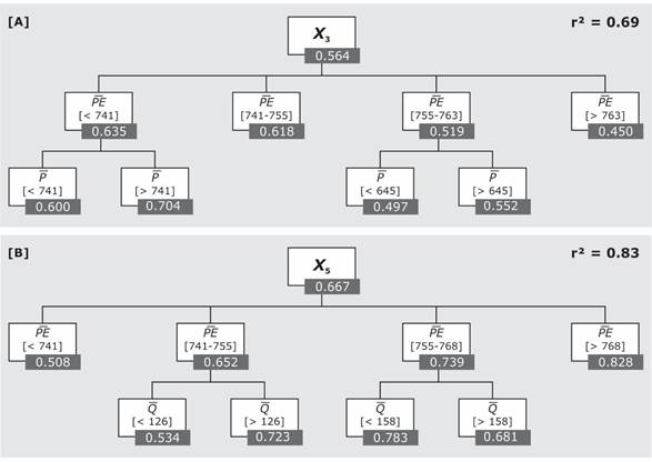 Figure 8 Tree regressions of GR2M-97 model parameters based on mean annual runoff (), rainfall () and potential evapotranspiration () by calibration period. A) Parameter X3; B) Parameter X5. In bold, coefficients of determination between observed and predicted parameter values.