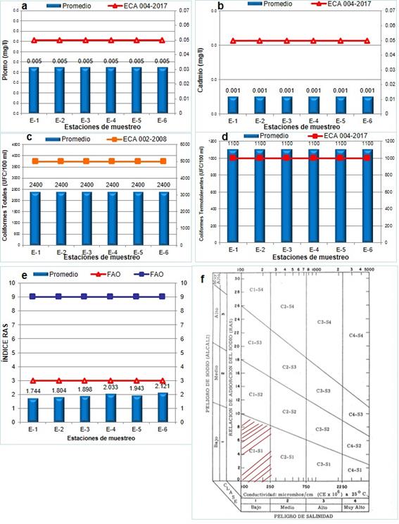 Figura 10 Evaluación de parámetros químicos y bacteriológicos: a) plomo; b) cadmio; c) coliformes totales; d) coliformes termotolerantes, y e) y f) determinación de índice y diagrama de RAS en la cuenca media del río Jequetepeque, Perú. ECA = estándares de calidad ambiental del agua-Perú (D.S. N°002-2008-MINAM) (MINAM, 2008). ECA = estándares de calidad ambiental del agua-Perú (D.S. N°004-2017-MINAM). FAO = Food and Agriculture Organization of the United Nations (FAO). Soil erosion (FAO, 2019).