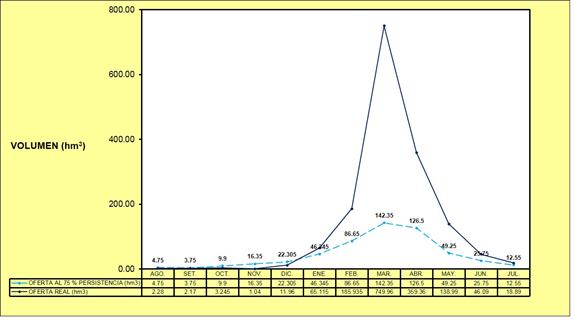 Figura 2 Oferta hídrica real al 75 % de persistencia en la cuenca del río Jequetepeque, Perú (agosto 2017-julio 2018).