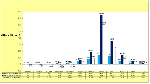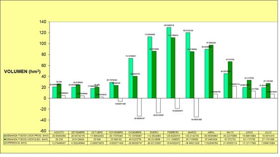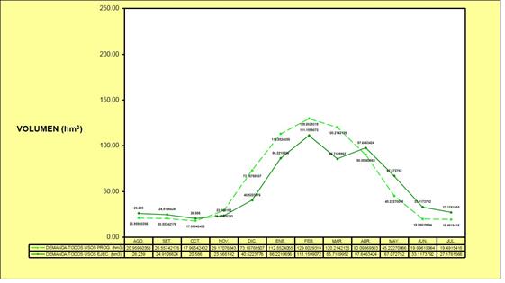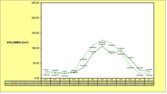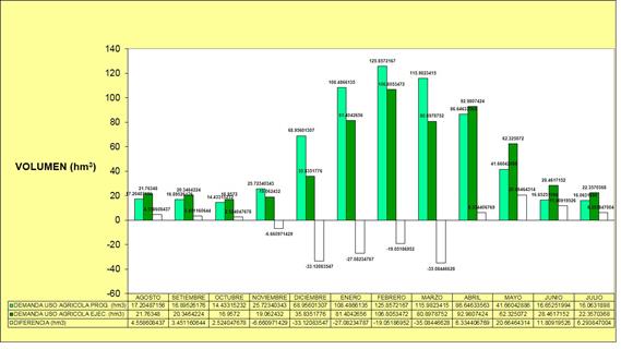La más alta demanda agrícola (Figura 6) fue en el mes de febrero, programada (125.8572167 hm3) y ejecutada (106.8053472 hm3); mientras que el mayor diferencial se produjo en los meses de marzo (35.08446628 hm3) y diciembre (33.12083547 hm3) (Figura 7).
