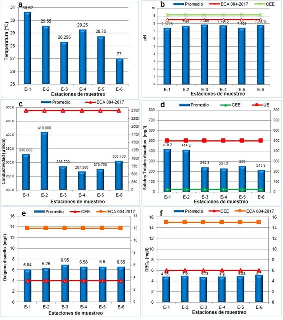 Figura 8 Evaluación de parámetros físico-químicos: a) temperatura; b) pH; c) conductividad; d) sólidos totales disueltos; e) oxígeno disuelto; f) demanda bioquímica de oxígeno en la cuenca media del río Jequetepeque, Perú. ECA = estándares de calidad ambiental del agua-Perú (D.S. N°004-2017-MINAM). CEE = Comunidad Económica Europea (Directiva 2008/105/CE DEL Parlamento Europeo y del Consejo de 16 de diciembre de 2008. UE = Unión Europea (UE, 2013) (Directiva 2013/39/UE del Parlamento Europeo y del Consejo de 12 de agosto de 2013).