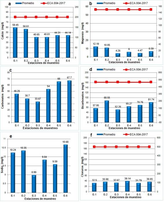 Figura 9 Evaluación de parámetros químicos: a) calcio; b) magnesio; c), carbonatos; d), bicarbonatos; e) sodio, y f) cloruros en la cuenca media del río Jequetepeque, Perú. ECA = estándares de calidad ambiental del agua-Perú (D.S. N°004-2017-MINAM).