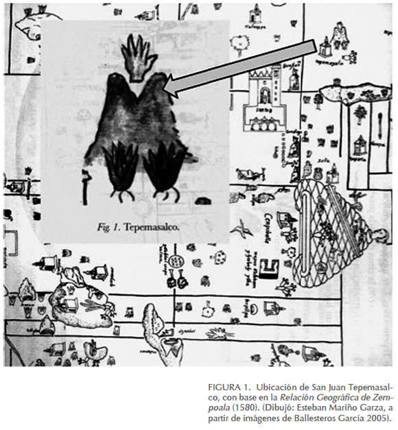 Por un lado, los orígenes y la historia temprana de este instrumento musical son temas que aún requieren investigación; por el otro, hay muy pocos estudios sobre la propia comunidad de Tepemasalco (v. gr. Ballesteros 2000:163; Kubler 1948:678). Por esto último, ha sido necesario trazar algunas líneas históricas generales, tomando como base la historia del municipio y población de Zempoala, lo cual es posible gracias a la correlación histórica existente entre ambas poblaciones. Uno de los planos contenidos en el estudio de Ballesteros García (2005:50) sobre la Relación Geográfica de Zempoala2 (Figura 1) indica la presencia temprana de la capilla de San Juan Bautista. Ello deja en evidencia que San Juan Tepemasalco fue un punto de contacto clave de Zempoala durante los primeros años de la Colonia.