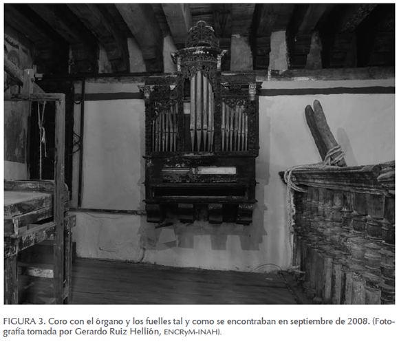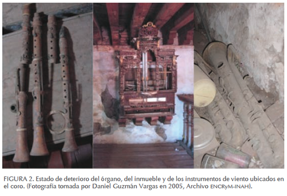 Informes orales de la propia comunidad (Sotero Morales, comunicación personal noviembre 2008) indican que durante un largo periodo del siglo XX las condiciones de conservación del templo de Tepemasalco fueron críticas. Sin embargo, éstas se optimizaron considerablemente en el año 2005, gracias a trabajos de restauración financiados por el gobierno del estado de Hidalgo y otros patrocinadores culturales. A partir de entonces, los estudiosos del órgano en México y, en general, del patrimonio de Hidalgo, contemplaron la posibilidad de restaurar el instrumento musical materia del presente artículo. De ahí que se decidiera notificar al INAH sobre la presencia de este peculiar aerófono. Ese mismo año, Daniel Guzmán Vargas, maestro laudero, fundador del Taller de Instrumentos Musicales de la ENCRyM y restaurador de éstos, hizo un primer dictamen sobre el estado físico del caso de San Juan Tepemasalco, en el que también se registraron instrumentos de viento que, al parecer, conformaron la dotación de la banda de la comunidad en el siglo XIX3 (Figura 2).