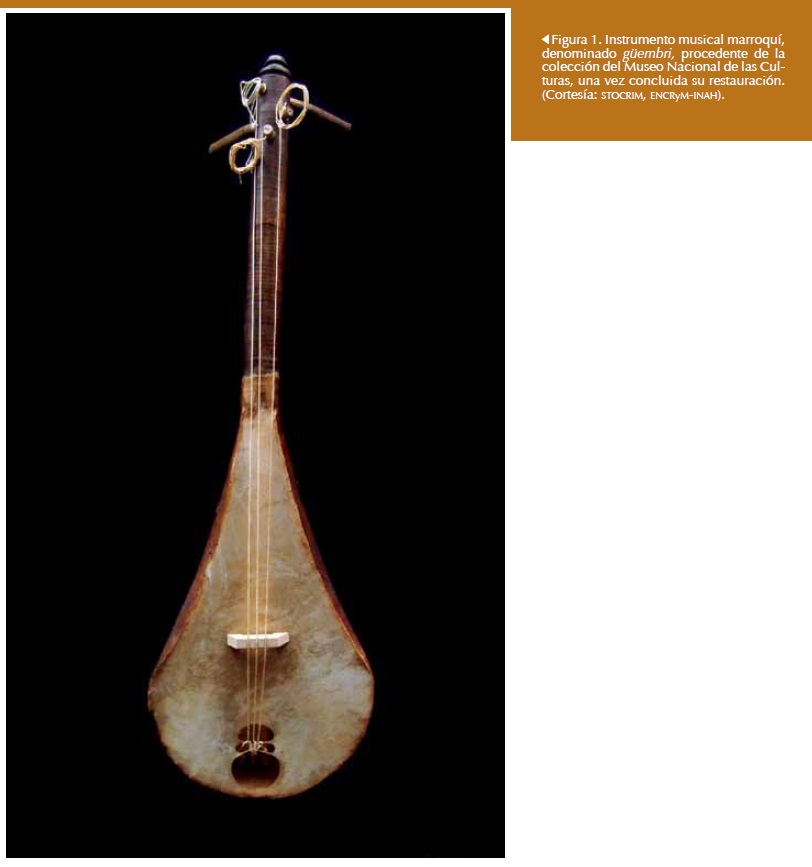¿Cómo recuperar la música de una cultura ajena a nosotros en tiempo y espacio?, es una pregunta a la que nos enfrentamos en el curso del Seminario-Taller Optativo de Conservación y Restauración de Instrumentos Musicales (STOCRIM), de la Escuela Nacional de Conservación, Restauración y Museografía (ENCRyM) del INAH. Efectivamente, como parte de la formación de estudiantes en estadía de la Escuela de Conservación y Restauración de Occidente (ECRO), durante 2009 y 2010 nos abocamos a la restauración1 de dos instrumentos musicales poco comunes debido su origen, materiales, tecnología y sistema de sonoridad: un cordófono pulsado procedente de Marruecos denominado güembri y un cordófono plectrado de origen chino llamado p'ip'a. Además de su particular estética -determinada por la forma y naturaleza de sus materiales constitutivos-, ambos constituyen piezas representativas del legado cultural musical de África y Asia, cuya presencia en nuestro país es excepcional.