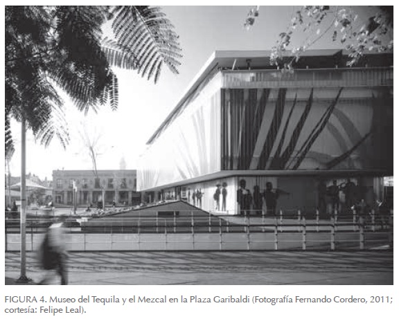 Y, ya como Autoridad del Espacio Público, acometimos la peatonalización de Madero, que se revitalizó, y hoy nos complacemos con la vista desde el presente de sus magníficos edificios del pasado. Intervenimos, asimismo, la Plaza de Garibaldi, otra zona emblemática de la ciudad que estaba muy abandonada, donde el planteamiento fue darle una nueva vida de día y quitarle el estigma de lugar nocturno e inseguro a través del remozamiento de la plaza, la inserción de juegos infantiles y vegetación, y la sustitución del falso pórtico-parián de los años ochenta con el nuevo edificio-lámpara que aloja al Museo del Tequila y el Mezcal, y que aporta a la plaza la luminosidad de algo contemporáneo (Figura 4).