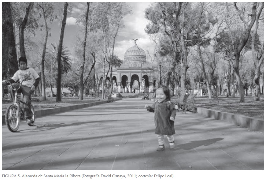 FL: Allí se recuperó el quiosco morisco restaurando su estructura metálica, todas sus piezas prefabricadas, sus colores y sus vitrales. Y se remozó la plaza cambiando pavimentos, eliminando los escalones y desniveles que tenía, recuperando sus fuentes y su vegetación. Se rescató así el centro de un barrio emblemático de la capital, el quiosco y la alameda, que son parte de la identidad de esa colonia (Figura 5).