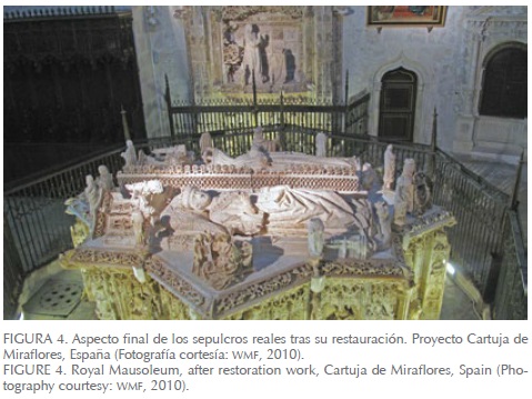 La Cartuja de Miraflores, cerca de Burgos, en Castilla y León, fue el lugar de descanso de Juan ll, rey de Castilla entre 1406 y 1454, su esposa, Isabel, y su hijo Alfonso, que murió en 1468, a los 14 años de edad, cuyos magníficos sepulcros ocupan un monasterio todavía habitado por cartujos, religiosos que guardan silencio durante todo el día, excepto durante las oraciones de la medianoche en la capilla real. El WMF, consciente de las necesidades de restauración del convento y de las limitaciones de la comunidad cartuja para hacer frente a sus desafíos económicos, se asoció en 2004 con la Junta de Castilla y León para restaurar la capilla, su magnífico retablo escultórico y los sepulcros reales (Figuras 3 y 4).