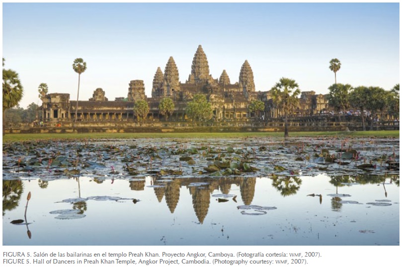 Cuando el WMF dio principio a su trabajo en Angkor, en 1989, Camboya estaba luchando por salir de dos decenios de guerra civil, genocidio, recesión económica y aislamiento diplomático. El WMF fue una de las primeras organizaciones internacionales que envió una misión de expertos a Angkor. Por invitación del gobierno camboyano, eligió el complejo de templos de Preah Khan como proyecto piloto para los trabajos, tanto de conservación como de capacitación de estudiantes y trabajadores camboyanos en la preservación (Figura 5).