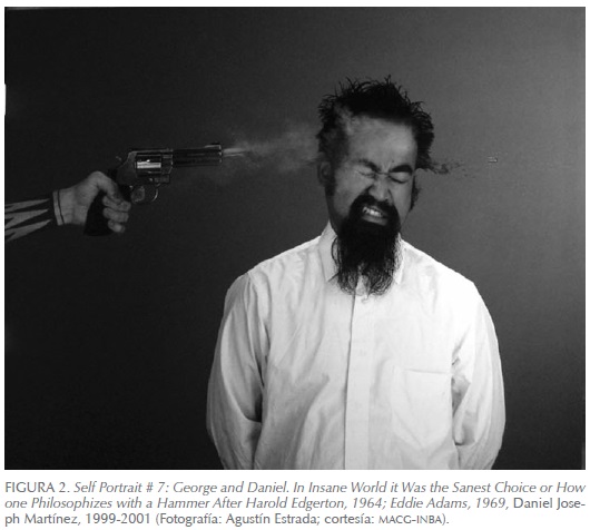 En esta misma línea se inscribía el estudio preparatorio (ca. 19561958) del mural Del Porfirismo a la Revolución, del Castillo de Chapultepec, de David Alfaro Siqueiros, que vincula la masa con el cadáver, la bandera y el sacrificio por una causa. En cuanto a las identidades, impactaba la fotografía de Daniel Joseph Martínez (Self Portrait # 7): alguien dispara una pistola sobre la cabeza de un hombre de ascendencia hispana, vestido, como un mártir, con camisa blanca (Figura 2).