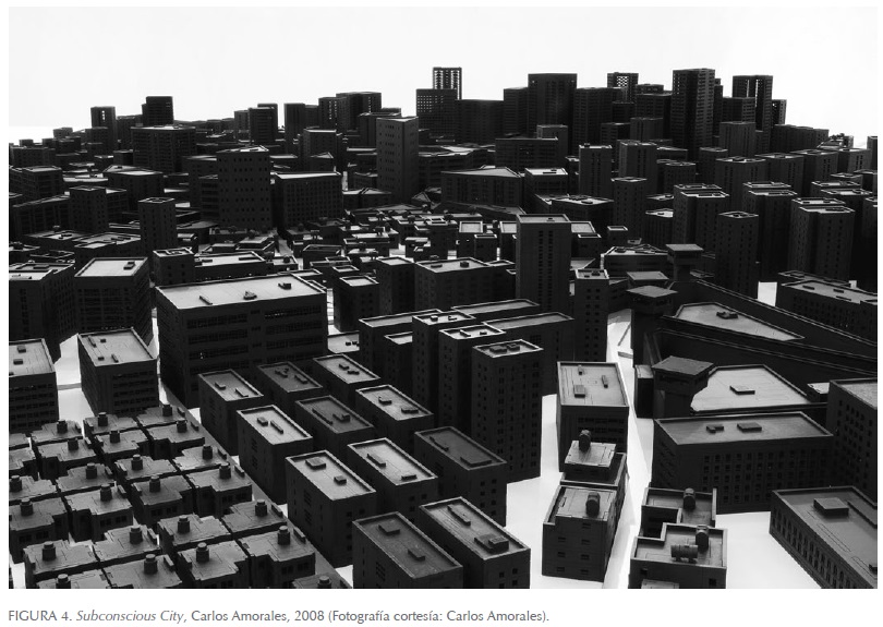 Las estructuras aislan, asfixian, desplazan al ser humano. Desde este ángulo, tanto la obra realizada en Nueva York por José Clemente Orozco, por ejemplo en Los muertos (1931), como la de Carlos Amorales, Subconscious City (2008) (Figura 4), donde la ciudad es un oscuro laberinto que consume a la humanidad, ofrecían un panorama desolador, como también sucedía en la visión solitaria de Planta (1980) de Ferrari y en la agresión denunciada en Casa mutilada (1950) de Siqueiros. En la pintura Invierno (1932) de Orozco y la gráfica Caminos I y II (1982) de León Ferrari era palpable la deshumanización asociada a la civilización: el ser humano convertido en un autómata, sin voluntad.