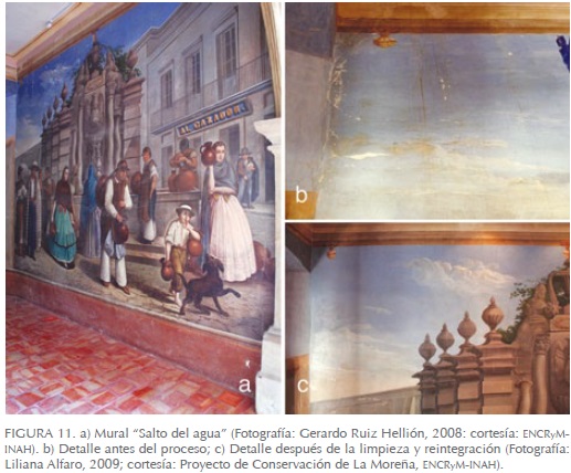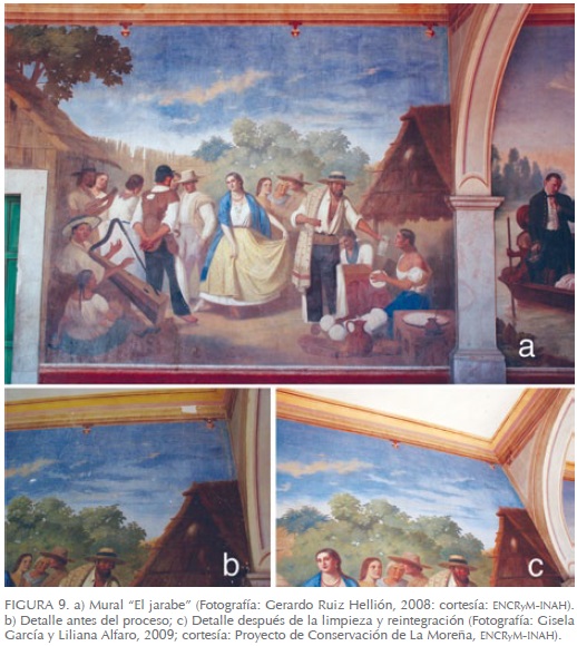 Al término de la intervención de 2009 se logró la reintegración cromática de cinco murales completos (aproximadamente, 40% del total de la obra mural): "Santo Domingo", "El canal de La Viga", "El jarabe" (Figura 9), "La procesión" (Figura 10) y "La portada"; la reintegración parcial de cuatro murales: "El columpio" (90% de avance), "Los chinacos" (70%), "Salto del agua" (70%) (Figura 11) y "La plaza" (30%).
