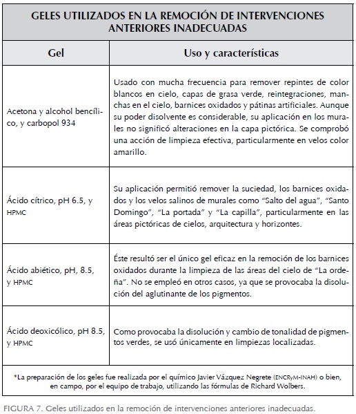 Los procesos utilizados durante este tratamiento incluyeron el uso de diversos solventes orgánicos en estado de gel, cuya acción química fue auxiliada por medios mecánicos. Tanto los efectos de diversos productos empleados en las intervenciones anteriores inadecuadas como las particularidades pictóricas de los murales requirieron soluciones específicas, tal y como lo resume la tabla subsecuente (Figura 7).