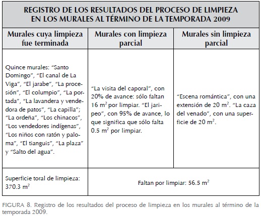 Cabe señalar que tanto las grandes dimensiones de las áreas por intervenir como la experimentación para encontrar los métodos más adecuados para hacerlo implicaron que la fase de limpieza requiriera más tiempo del planeado originalmente. No obstante, al término del proyecto 2009 se había logrado limpiar por completo quince murales y sólo dos de manera parcial, ubicados en los pasillos. El avance de las zonas limpiadas corresponde aproximadamente a 85% de la superficie de obra mural de la casa de La Moreña. En la siguiente tabla (Figura 8) se exponen los resultados al término de la temporada de 2009.