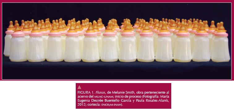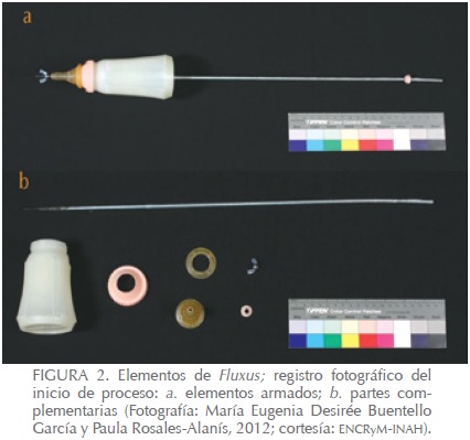 En agosto de 2012, Fluxus llegó al Seminario-Taller de Restauración de Obra Moderna y Contemporánea (STROMC) de la Escuela Nacional de Conservación, Restauración y Museografía del Instituto Nacional de Antropología e Historia (ENCRyM-INAH) para su conservación-restauración. La obra estaba compuesta por un total de 135 azucareras de polietileno, cada una con seis partes: tapa, chupón y arillo de látex, varilla, con mariposa metálica, y tope de goma. Cada azucarera contaba con un recubrimiento interno de esmalte acrílico de color amarillento aplicado con pincel de aire. Pintada de color rosa con idéntico procedimiento, su tapa estaba cortada por un extremo, en el que se integró, para simular la figura de una mamila, un chupón de látex y un arillo (recortado de los propios chupones). A estos elementos los atraviesa, por el centro de la base del recipiente plástico hasta el chupón, una varilla de metal (Figura 2). Con cada una de estas piezas la artista hace alusión directa al busto femenino; el color amarillento de su interior remite a los flujos (fluxus) internos del cuerpo y el rosado de las tapas y los chupones representa un pezón.