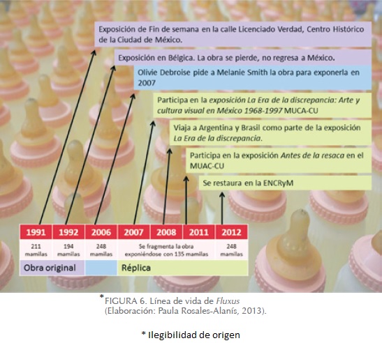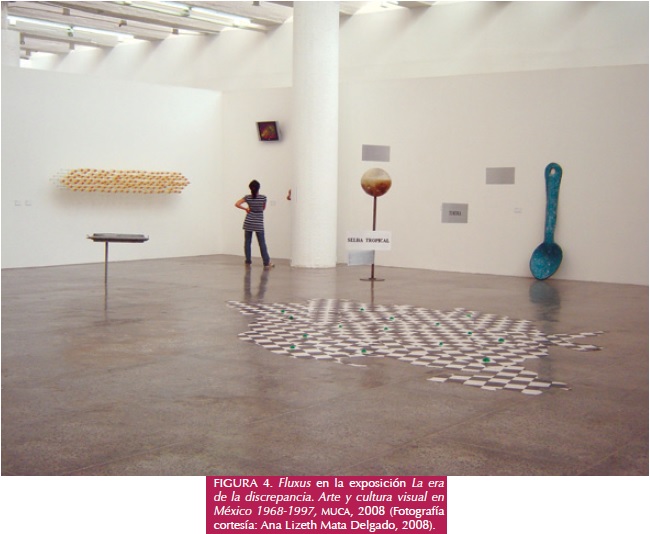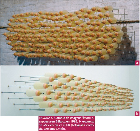 La entrevista con Melanie Smith (2012b) reveló antecedentes de Fluxus que no estaban documentados en otras fuentes, como el hecho de que la actual es una obra de reelaboración: su primera versión, creada en 1991 para la denominada Exposición de fin de semana, que tuvo lugar en un departamento en la calle Licenciado Verdad, en el Centro Histórico de la ciudad de México (Debroise 2006:397) viajó al año siguiente a Bélgica, de donde no regresó. En 2007, por petición de Olivier Debroise, curador del Museo Universitario de Ciencias y Arte (MUCA, México), se reelaboró, ya que se consideró necesario contar con una obra representativa de la década de 1990 para la exposición La era de la discrepancia. Arte y cultura visual en México 1968-1997 (Figura 4). Smith produjo una nueva pieza, que con dicha exposición itineró a Brasil y Argentina. Por último, en 2011, Fluxus se expuso en el MUAC-UNAM como parte de la exposición Antes de la resaca.