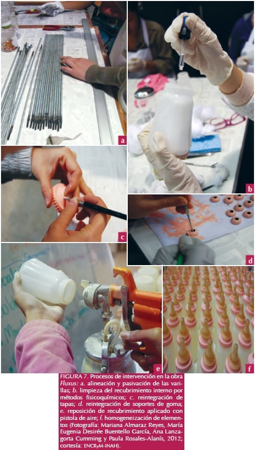 Se decidió, entonces, retirar el recubrimiento interno por métodos fisicoquímicos y colocar una nueva capa con pintura acrílica, aplicada por aspersión, formando una película delgada que, aparte de recuperar la técnica de manufactura de la artista, garantiza una mayor vida útil. Por su parte, las varillas se enderezaron y pasivaron, las tapas rotas se sustituyeron, y, por medio de moldes, se reintegraron y repusieron nueve arillos faltantes (Figura 7). También fue esencial, como consecuencia de este trabajo de intervención, que en el informe de restauración se puntualizara que los elementos que componen la obra son tan importantes como su mismo montaje, del cual depende su unidad y expresividad (Almaraz Reyes et al. 2012).