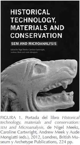 Reseña del libro intitulado Historical Technology, Materials and Conservation: SEM and Microanalysis, editado por Nigel Meeks, Caroline Cartwright, Andrew Meek y Aude Mongiatti, impreso por Archetype Publications en asociación con el British Museum, Londres 2012. El libro contiene las versiones escritas de las ponencias de la reunión "SEM and microanalysis in the study of historical technology, materials and conservation" llevada a cabo en el British Museum del 9 al 10 de septiembre de 2010, organizada por el Departamento de Conservación e Investigación Científica del British Museum en asociación con Hitachi High-Technology de Europa.
