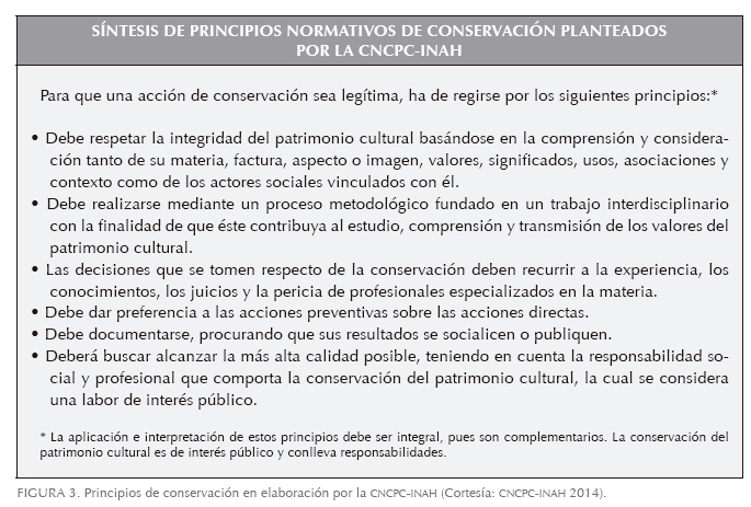 La de normatividad y principios es una de las líneas de acción de la CNCPC-INAH, cuya finalidad consiste en dotar a la institución de un cuerpo de documentos normativos de observancia general para la conservación del patrimonio cultural competencia del INAH, rubro en el que se han desarrollado: una política institucional de conservación, los principios básicos que rigen toda intervención (Figura 3) e, incluso, un glosario de términos para facilitar la comunicación entre profesionales.