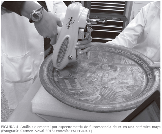 En esta línea de acción, la CNCPC-INAH efectúa labores de investigación aplicada que responden a los requerimientos y demandas planteados en los diferentes proyectos de conservación del patrimonio cultural que ahí se ejecutan. Adicionalmente se ha programado una agenda de investigación institucional, de la que se desprenden los futuros proyectos, que consta de los siguientes rubros: a) caracterización y diagnóstico de materiales culturales (Figura 4); b) y c) evaluación y desarrollo, respectivamente, de productos y métodos de intervención; d) monitoreo de tratamientos de conservación; e) investigación y recuperación de la historia de algunas comunidades que trabajan en la preservación de su patrimonio, y f) y g) investigación en conservación para el diseño de indicadores, y sobre su teoría y normatividad, respectivamente.