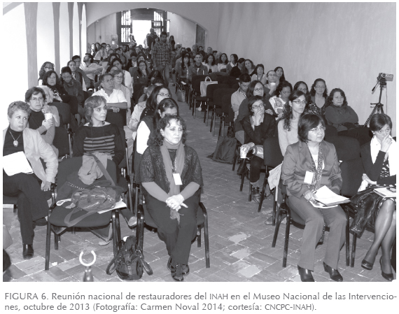 Finalmente, en el 2013, la CNCPC-INAH promovió una reunión nacional de restauradores del INAH que hizo posible elaborar un análisis conjunto sobre el funcionamiento de las áreas de conservación en nuestro instituto (Figura 6), a partir de la cual se ha convocado a reuniones regionales para examinar problemáticas específicas de cada territorio, útiles, asimismo, para establecer redes de colaboración regionales. Como estos encuentros han rendido frutos, se pretende que aquella reunión con restauradores de todo el país auspiciada por la CNCPC-INAH se formalice como una actividad anual, ya que con ello se dispondrá de un foro importante de intercambio en nuestro ámbito profesional.